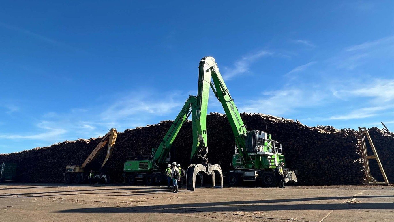 A colheita é totalmente mecanizada, com dois tipos de máquinas, as harvesters (que derrubam as árvores no campo e tiram a casca delas) e as forresters, que pegam esses troncos e transportam de um ponto a outro nas fazendas.