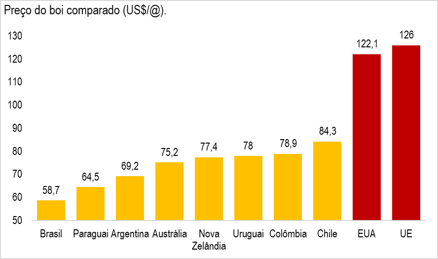 A verdade é que o clima tropical, a abundância de recursos hídricos e a fortíssima aptidão brasileira para a produção agrícola (incluindo aí a produção de pastagens) fazem com que o gado do Brasil seja 14% mais barato do que a média ponderada global dos principais exportadores de carne bovina. Em 2025, essa relação atingiu seu ápice, e o Brasil apresentou preços 23% mais baratos do que a média global.