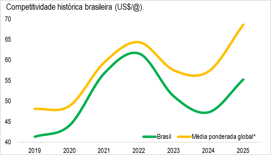 Com os concorrentes encarando restrições na produção, a competitividade brasileira continuará em destaque. Mesmo com uma oferta menor, o mundo ainda recorrerá ao bom volume, ao bom preço e à solidez de fornecimento que o Brasil tem para oferecer.