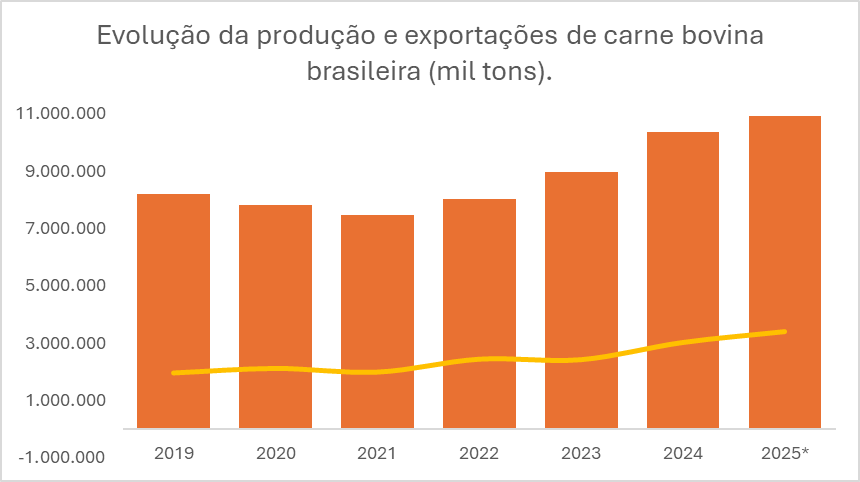 Tudo isso contribuiu para um aumento de oferta substancial, que faz com que a produção de carne brasileira estimada para 2025 supere em quase 6% o pico atingido anteriormente, em 2024.
