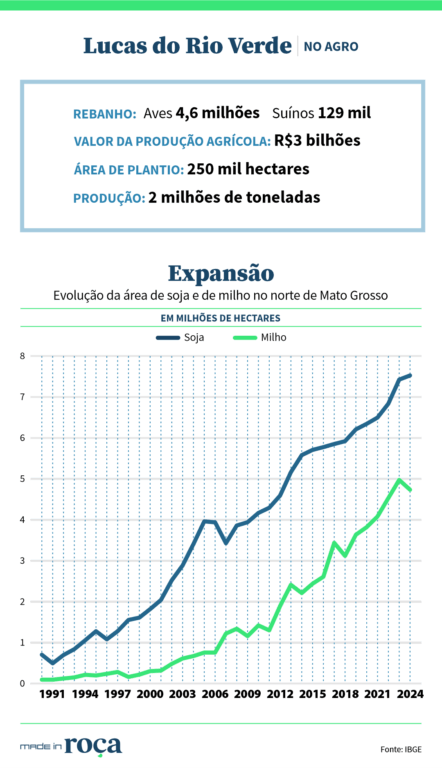 Hoje, Lucas do Rio Verde é o 14º município em área de produção no Mato Grosso (são 250 mil hectares de área agrícola), mas já é a sexta economia do estado. “Se tirar Cuiabá e Várzea Grande da conta, que não são áreas de produção de grãos, a cidade ficaria em quarto lugar”, ressalta Miguel Vaz, prefeito de Lucas do Rio Verde.