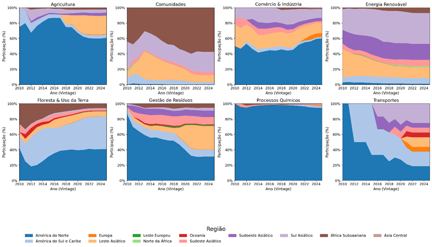 A América do Sul praticamente não aparece no gráfico. Por razões biogeográficas e de composição de biomas, os projetos sul-americanos de carbono seguem concentrados no setor florestal, segmento em que dividimos a liderança com os norte-americanos.