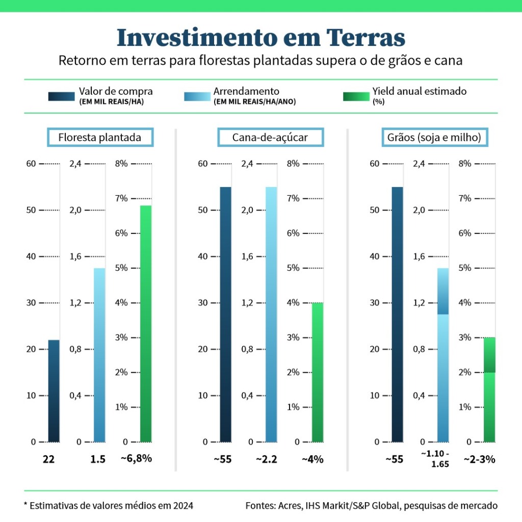 Dados compilados pela consultoria Acres com base nas informações da S&P Global mostram que o preço das terras para silvicultura mais do que quadruplicou a longo das últimas décadas. Em 2008, o preço médio de um hectare com vocação para silvicultura estava em torno de R$ 5 mil. Em 2024, atingiu R$ 22 mil.